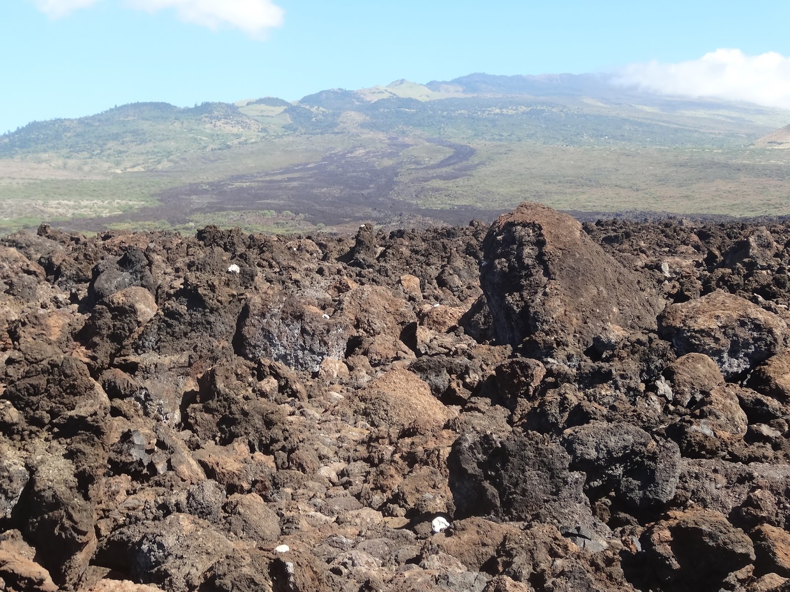 Look closely and you can make out the white coral trail markers. In the background you can see where the lava flowed down the hillside 200 yrs ago. |